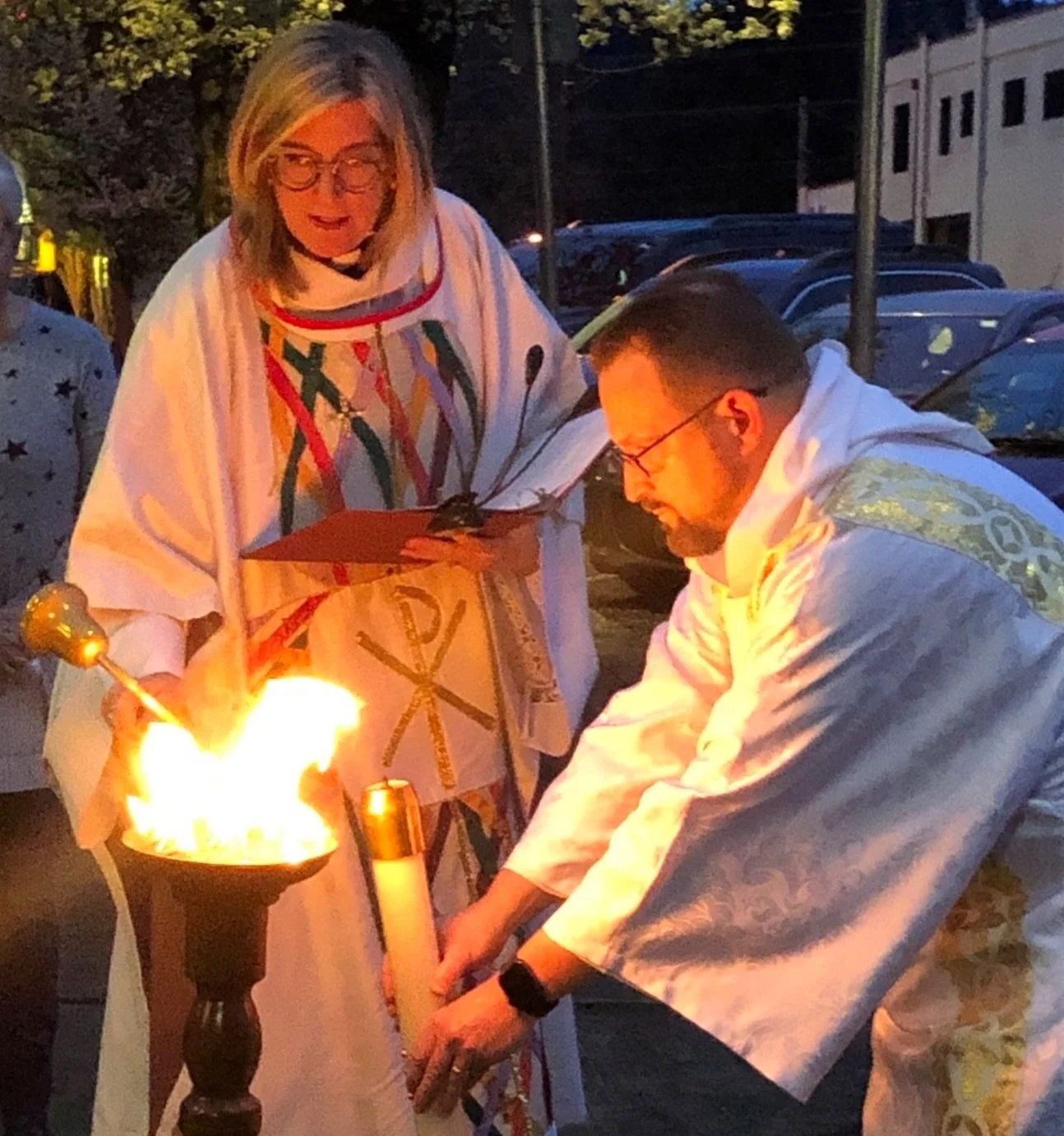 The first service of Easter Day, the Great Vigil of Easter begins in the darkness after nightfall on Saturday. We gather on the front steps to kindle the New Fire to light the Paschal Candle, listen to our deacon chant the Exsultet to proclaim the reconciliation of heaven and earth, and renew our Baptismal Vows.